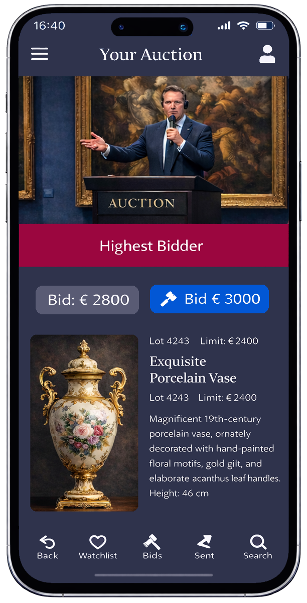 עם קונסולת אולם המכירות תוכלו להעביר מכירות פומביות קלאסיות לאינטרנט – בצורה סינכרונית ומובנת. אנשי הצוות בבית המכירות פועלים עם הקונסולה ומעבירים שלבי הצעות, זכיות ושינויים בלאט בזמן אמת. המשתתפים המקוונים יכולים לעקוב אחרי המכירה בווידיאו, כמו כן להגיש הצעות חיות דרך האתר או האפליקציה, מבלי עיכוב, כאילו ישבו ישירות באולם. גם בתחום זה ניתן ליישם, לדוגמה, צעדי הצעה מוסתרים כמו הצעות אוטומטיות ממסמכים.