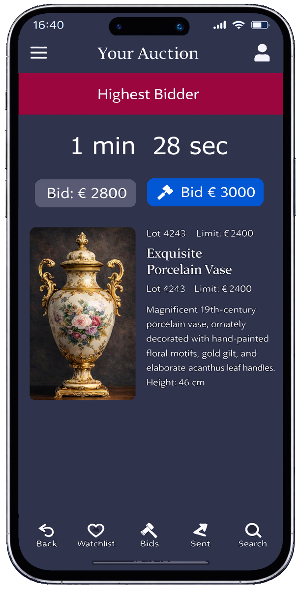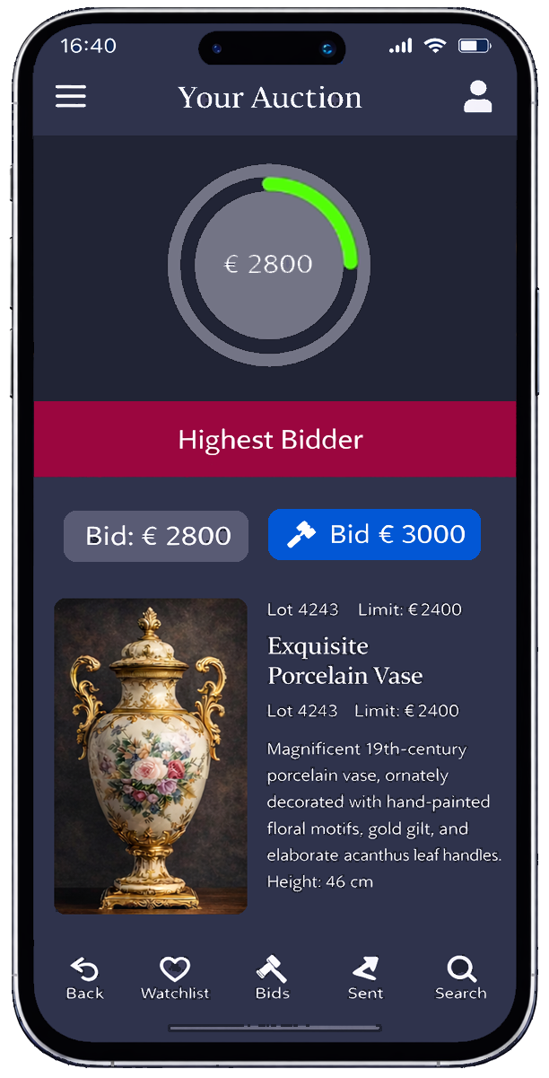 רשימת הפריטים שלכם יכולה להיות מוצגת כקטלוג מודרני – כולל תמונות תצוגה, מחירי התחלה, הצעות נוכחיות ותצוגות סטטוס ברורות. במכירות פומביות פעילות, הצעות מעודכנות באופן דינמי, כך שמציעים תמיד רואים היכן הם עומדים – ללא צורך ברענון מתמיד וללא בלבול.